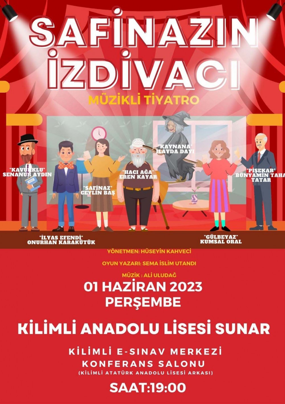 1 Haziran Perşembe günü saat 19:00 da yine Kilimli e-Sınav Merkezi Konferans Salonunda öğrenciler tarafından Safinaz’ın İzdivacı isimli orta oyunu müzikli tiyatro türünde sahnelenecek.