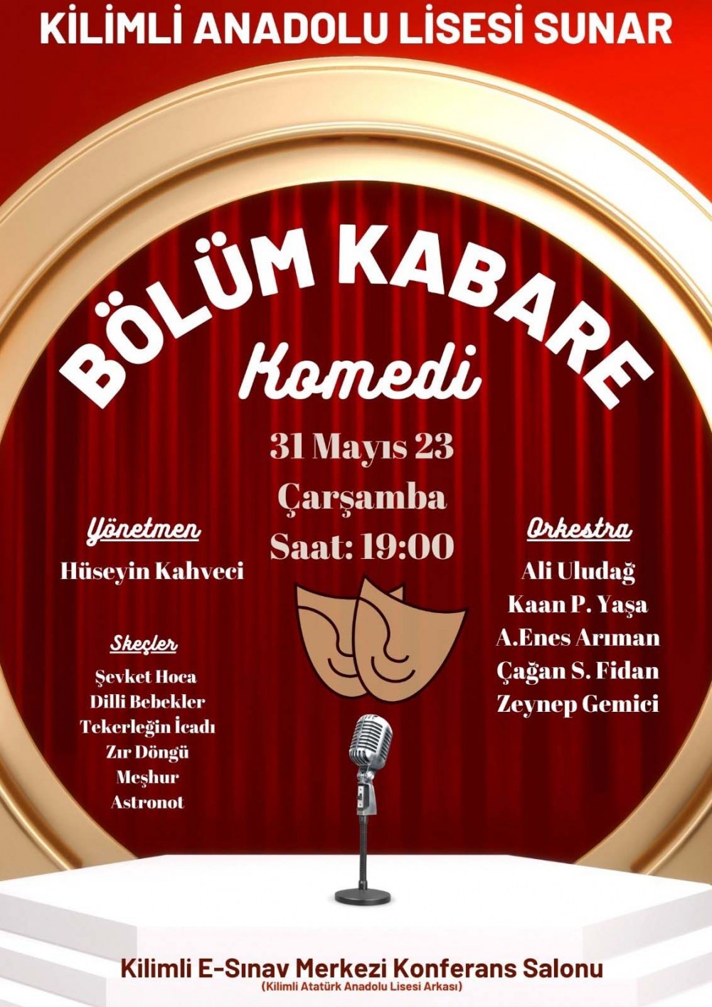 31 Mayıs Çarşamba günü saat 19:00’da Kilimli e-Sınav Merkezi Konferans Salonunda komik skeçler ve hareketli şarkılarla, eski yılların kabare kültürü Kilimlide tekrar canlanacak. Altı adet skecin ve şarkıların yer aldığı programda öğrenciler tüm yeteneklerini sergileyecekler.