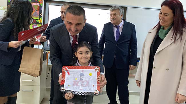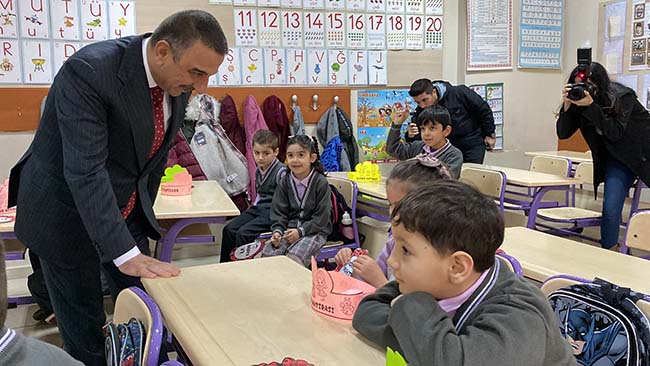 Vali Osman Hacıbektaşoğlu 1/B sınıfında öğrencilerin karnelerini dağıtarak sevinçlerini paylaştı.