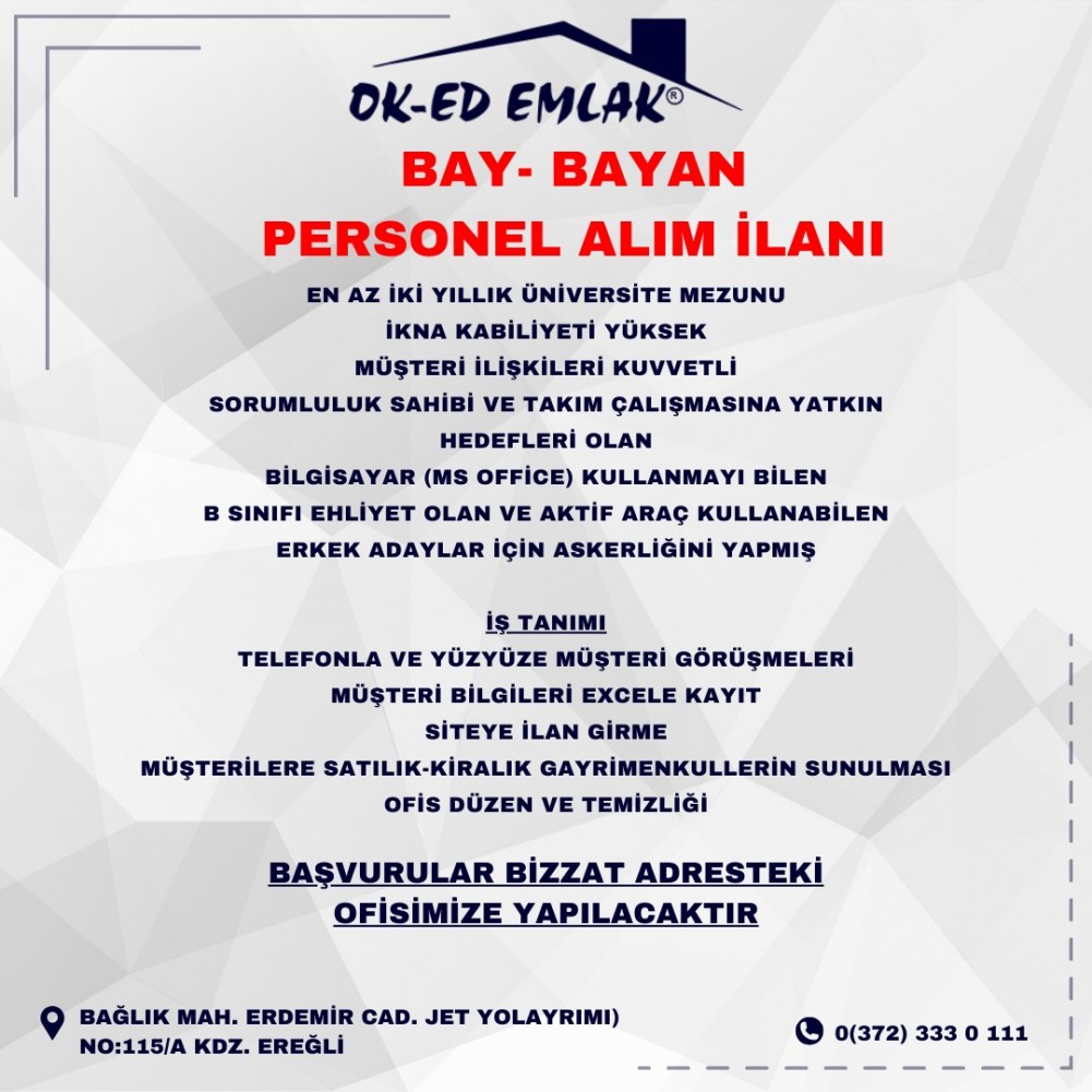 Karadeniz Ereğli'de faaliyet gösteren OK-ED Emlak bünyesinde çalıştırmak üzere personel arıyor.