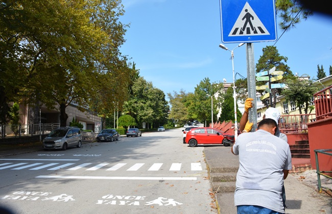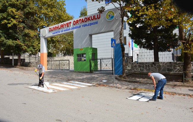 Başkan Halil Posbıyık’ın talimatıyla Ulaşım Hizmetleri Müdürlüğü, Fen İşleri Müdürlüğü ve İmar ve Şehircilik İşleri Müdürlüğü Numarataj Birimi ortaklaşa olarak okul önlerinde yaya geçidi yapıyor. Ekipler ayrıca, okul bölgesini gösteren çeşitli uyarıların yer aldığı tabelaları dikiyor.