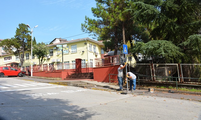 Kdz. Ereğli Belediyesi, okul bölgelerinde araç ve yaya trafiğini daha güvenli hale getirmek için yaya geçidi yapıyor ve uyarı levhaları dikiyor.