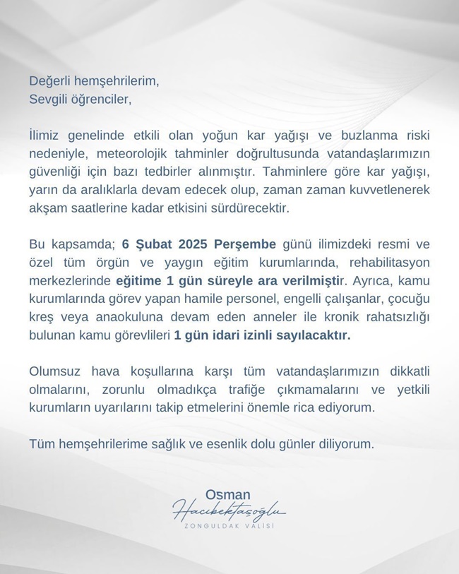 Zonguldak Valiliği olumsuz hava koşulları ve kar yağışı nedeniyle yaptığı açıklamada; 6 Şubat 2025 Perşembe günü il genelinde resmi ve özel tüm örgün ve yaygın eğitim kurumlarında rehabilitasyon merkezlerinde eğitime 1 gün süreyle ara verildiği belirtildi.