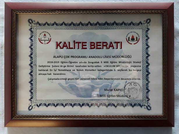 Proje kapsamında Zonguldak İl Milli Eğitim Müdürlüğü'nün tarafından belirlenen standartlar üzerinden "En İyi Okul Kantini", "En İyi Beslenme Alanı-Yemekhane", "En Güzel Okul Bahçesi" kategorilerinde başvuru sonucunda Yemekhane ve Yemek Hizmetleri Kategorisinde Alaplı Çok Programlı Anadolu Lisesi 1, olmuş olarak kalite beratı almaya hak kazanmış ve Yemekhane ve Yemek Hizmetleri Kategorisinde Alaplı İMKB Anadolu Lisesi Teşvik Ödülüne layık görüldü. Bahçe kategorisinde ise Alaplı Kasımlı İlkokulu Teşvik Ödülüne giren Okullar Zonguldak'da yapılan törenle ödüllendirildiler.