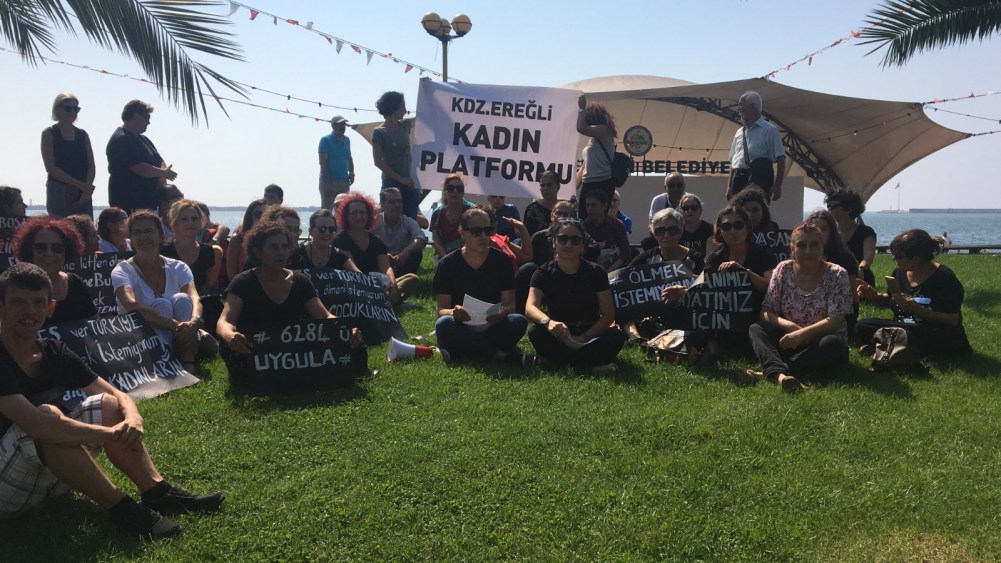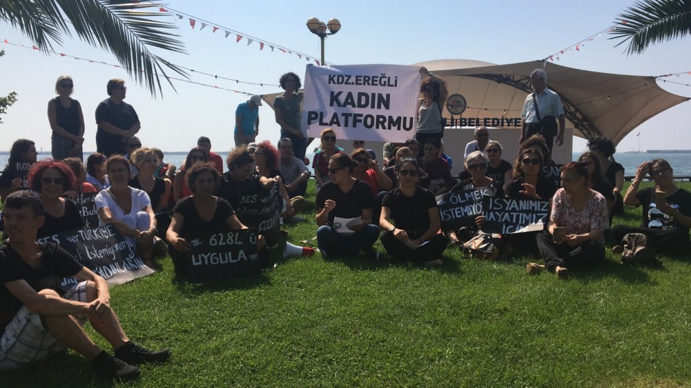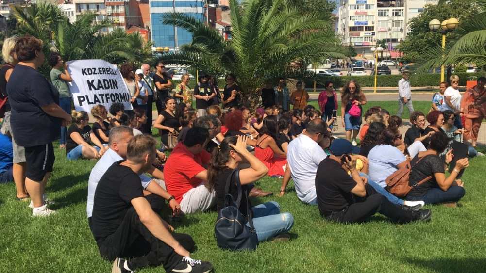 Zonguldak’ın Ereğli ilçesinde Kadın Platformu tarafından Kırıkkale’ de eski eşi tarafından öldürülen Emine Bulut için oturma eylemi yapıldı.