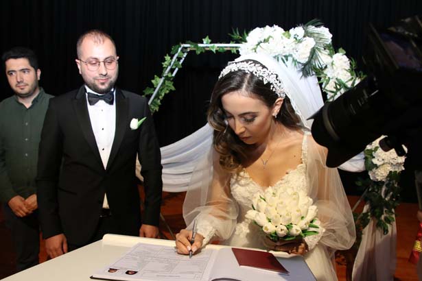 Oldukça samimi ve sıcak bir ortamda gerçekleşen nikah akdi sonrasında nikah memuru evlilik cüzdanını gelin Hanım Seher Emir’e teslim etti.
