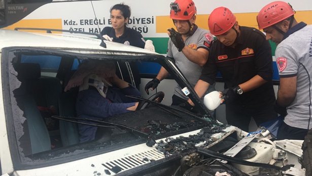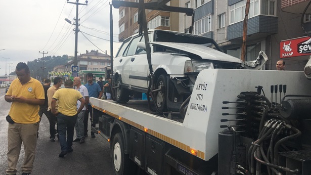 Kaza Devrek Yol Ayrımı mevkiinde 13.30 sularında meydana geldi. Alınan bilgilere göre Güler S. idaresindeki 67 SL 476 plakalı otomobil sürücüsü yağışlı hava nedeniyle direksiyon hakimiyetini kaybederek önce refüjde bulunan aydınlatma direğine ardından da yolcu almak üzere durağa yaklaşan Mustafa D.(34) idaresindeki 67 M 8250 plakalı halk otobüsüne çarparak durabildi. Kazayı görenler 112 sağlık ekiplerine ve polise haber verdi. Kaza yerine çok sayıda ambulans, polis ve itfaiye ekipleri yönlendirildi. Kazada otomobil sürücüsü Güler S. (53) ve otomobilde yolcu olarak bulunan gelini Nurtaç S.(31) halk otobüsünde yolcu olarak bulunan Belda B.(40) yaralandı. Yaralı sürücü Güler S. sıkıştığı otomobilden itfaiye ekiplerinin yardımı ile araçtan çıkarıldı. Yaralılar olay yerine gelen sağlık ekiplerinin ilk müdahalesinin ardından hastaneye kaldırıldı. Yaralıların sağlık durumunun iyi olduğu öğrenilirken kazada hurdaya dönen otomobil çekici yardımı ile olay yerinden kaldırıldı. Savcılık olay ile ilgili soruşturma başlattı.