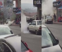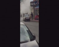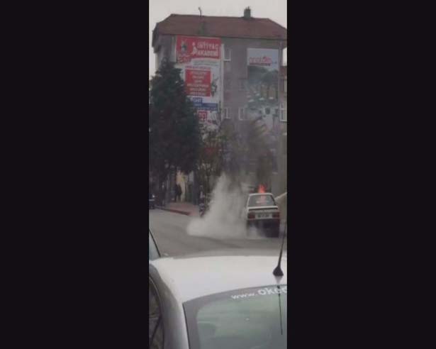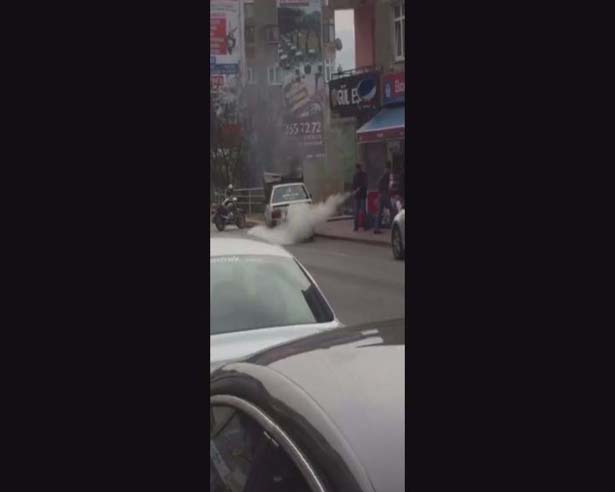 Zonguldak'ın Ereğli ilçesinde hareket halindeyken yanmaya başlayan otomobile müdahale etmeye çalışan sürücüsü, yangın tüpünün çalışıp çalışmadığını kontrol ettikten sonra yangına müdahale etti.