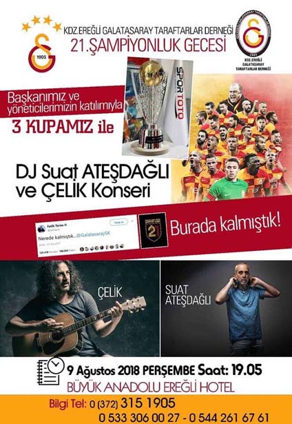 Kdz.Ereğli Galatasaray Taraftarlar Derneği olarak ; taraftarlarımıza muhteşem çoşkuyu yaşatmak İçin 9 Ağustos günü buluşuyoruz.09 Ağustos günü 19.05 'te başlayacak balomuzu , Galatasaray Spor muhabirliği yapan , dibine kadar taraftar ünlü oyuncu ve sunucu Yalçın Dümer 'in sunacağı geceye , DJ Suat Ateşdağlı 'nın performansı ve sanatçı Çelik konseri damga vuracak."