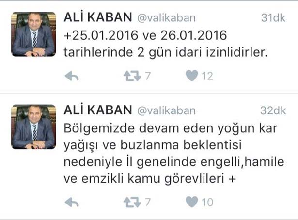"Bölgemizde devam eden yoğun kar yağışı ve buzlanma beklentisi nedeniyle il genelinde "Engelli, Hamile ve Emzikli" kamu görevlileri 25-Ocak Pazartesi ve -26 Ocak Salı günleri 2 gün idari İzinlidirler" denildi.