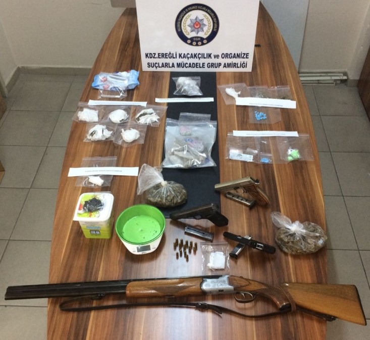 Ereğli Cumhuriyet Başsavcılığı koordinesinde yapılan operasyonda gelen ihbarı değerlendiren Ereğli ilçe Emniyet Müdürlüğü Kaçakçılık ve Organize Suçla Mücadele büro amirliği ekiplerinin teknik ve fiziki takibi sonucu sabah saatlerinde operasyon düzenledi. Operasyonda aralarında iş yeri sahibi, taksici, sürücü eğitmeni ve işçilerin bulunduğu Ö.K., S.E., B.C.Y., T.Ö., C.Ö., B.T. ve Ö.K. gözaltına alındı. Göz altına alınan şüphelilerin ev ve iş yerlerinde yapılan aramalarda 1 hassas terazi, 1 sarma sigara, 1 kurusıkı tabanca, 2 ruhsatsız tabanca, 1 tüfek, 14 fişek204 uyuşturucu hap, yaklaşık 300 gram uyuşturucu ve kilitli şeffaf poşetler ele geçirildi. İfadeleri için ilçe emniyet müdürlüğüne götürülen şüphelilerin işlemlerinin devam ettiği öğrenildi.