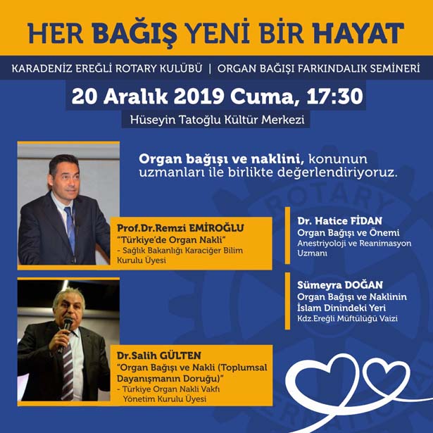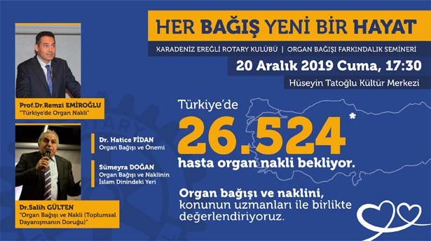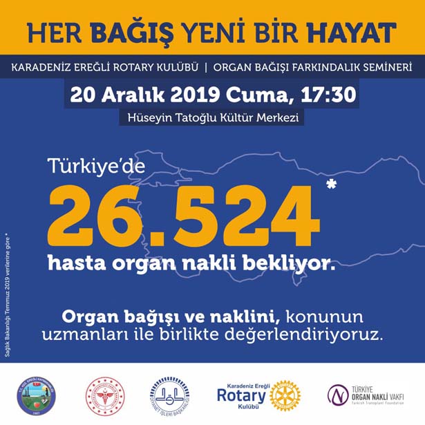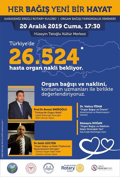 Karadeniz Ereğli Rotary Kulübü tarafından düzenlenen “Her Bağış Yeni Bir Hayat…” Organ Bağışı Farkındalık Semineri 20 Aralık 2019 Cuma Saat 17.30 da Hüseyin Tatoğlu Kültür Merkezi’nde ücretsiz olarak gerçekleşecek.