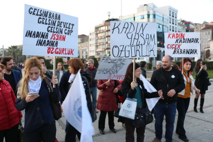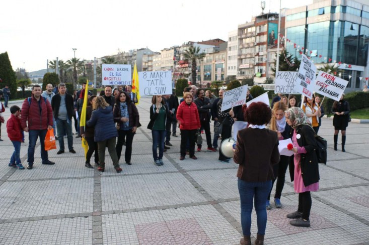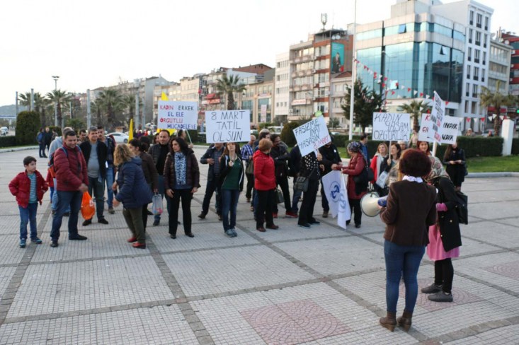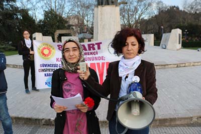 Sağlık ve Sosyal Hizmet Emekçileri Sendikası temsilcisi Hamide İpek, 8 Mart'ın direniş ruhunun temellerinin 1857 yılında New York kentinde, düşük ücretle, insanlık dışı koşullarda çalışmak zorunda bırakılan emekçi kadınların mücadelesi ile atıldığını belirtti. İpek konuşmasında "Aklımız, emeğimiz ve bedenimiz üzerindeki her türlü baskıya, sömürüye ve şiddete son vermek için sürdürdüğümüz eşitlik ve özgürlük mücadelesini kadın dayanışması ile büyütüyoruz. Bu yıl 60 ülkede eş zamanlı kadın eylemleri ve kadın grevleri ile tüm kadınlar birbirimize ses oluyoruz: Dünyanın dört bir yanında ki kız kardeşlerimizle birlikte yükselen faşizme, emek sömürüsüne, erkek-devlet şiddetine karşı eşitlik ve özgürlük mücadelesini büyütüyoruz! Cinsiyetçi ideoloji düzenin işleyişinde, kültür, eğitim, medya, aile içinde artarak üretilmeye devam ediyor. Kadın bedeni üzerinden siyaset yapan hükümet ve temsilcileri, kadın adına düşünmekte, karar vermekte ve uygulamakta ısrar ediyor. Kadınların siyasi iradesi olan vekilleri tutuklayarak, 8 Mart' ı yasaklayarak, kadınların emeğine saldırarak, kadın örgütlerini kapatarak, gerici anlayışla tek tip bir yaşam biçimini dayatarak yükselen kadın özgürlük mücadelesini boğmaya çalışıyor. 15 Temmuz darbe girişimini her türlü dayatmaya bahane olarak kullanan siyasal iktidar gece yarıları çıkardığı KHK' lar ile binlerce kadını mesleğinden ihraç etti. 12 Eylül darbesine rahmet okutan ve 20 Temmuzdan bu yana ilan edilen OHAL' in sınırlarını aşan sıkıyönetim uygulamalarıyla en temel hakların dahi kullanımını hukuksuzca ve keyfiyetle engelliyor. Her kriz döneminde olduğu gibi işsizliğin, yoksulluğun, ayrımcılığın en ağır faturası ise şüphesiz yine kadınlara ödettirilirken bir de esnek ve güvencesiz çalışma ile kadın emeği sermayenin sömürüsüne açılıyor. Bizi işimizden, iş güvencemizden ve iş yerlerimizden koparmaya çalışanlara buradan bir kez daha sesleniyoruz. Biz kalacağız. Aylardır OHAL keyfiyeti ve hukuksuzluğuyla bizi terbiye etmeye çalışanlar şimdi de bizi süreklileştirilmiş bir OHAL'de yaşamaya mecbur kılmak istiyorlar. Başkanlık dayatmasıyla haklarımızı, geleceğimiz ve irademizin ipotek altına almak istiyorlar. Yasama, yargı ve yürütmenin tek bir kişinin emrine verildiği, erkin tek bir erkekte toplandığı diktatörlük yasasına karşı hayatlarımıza sahip çıkıyoruz. Savaşsız, sömürüsüz bir dünya için HAYIR diyoruz! Katliam, göç, yoksulluk ve sistematik şiddete dur demek için HAYIR diyoruz! Emeğimiz, kimliğimiz, kentimiz, toprağımız bizimdir demek için HAYIR diyoruz! Eşitlik ve özgürlük mücadelemizi her yerde sürdüreceğiz. Tacizcileri, tecavüzcüleri ve kadın katillerini kollayanlara, çocuk istismarını yasalaştırmaya çalışanlara, 'Boşanırsan öldürürüm' diyen erkek akla, kadını 'son bir kez' affetmeye zorlayan devletin en küçük birimi olan aileye, kadını eş-çocuk-ev üçgeninde boğmaya çalışan devlete ve emeğimizi sömüren sermayeye teslim olmayacağız. Kadınların varlığını ve mücadelesini zorba düzenleri için tehdit olarak görenler bu yıl pek çok yerde OHAL' in arkasına sığınarak 8 Mart'ı yasaklamak istediler. Kadınların isyanını, direnişlerini ve Hayır'larını sokaklarda haykırmasından korkanların baskı ve tehditleriyle oluşturmak istedikleri karanlığı yine kadınların örgütlü mücadelesi yırtacak. 8 Mart yasaklarını tanımıyoruz ve hayatın her alanında kadın erkek eşitliğine giden yolda yürümekten asla vazgeçmeyeceğiz. Dünyanın yarısını oluşturan biz kadınlar evde, sokakta, okulda, işte ve hayatın her alanında, toplumsal yaşamda bizleri yok saymaya çalışan sisteme karşı direnmeye devam edeceğiz. Haklılığımızdan ve mücadelemizden aldığımız güçle taleplerimizi bir kez daha buradan ifade ediyoruz: OHAL ve KHK rejimi son bulmalı, haksız hukuksuz yere işten atılan binlerce emekçi görevine iade edilmelidir. Esnek, güvencesiz, kayıt dışı çalışmaya son verilmeli, güvenceli ve insana yakışır çalışma koşulları sağlanmalıdır. Kadın istihdamının önündeki en büyük engel olan bakım sorumluluğunun erkek-devlet ve işveren tarafından paylaşılmasını sağlayan yasal düzenlemeler hayata geçirilmelidir. Başkanlık dayatmalarından vazgeçilerek tüm kesimlerin hak ve taleplerinin yer aldığı, her türlü ayrımcılığa son verecek, eşitlikçi, özgürlükçü ve demokratik bir anayasa toplumsal mutabakatla hazırlanmalıdır. İçeride ve dışarıda yürütülen savaş politikalarından vazgeçilerek halkların bir arada ve eşit yaşadığı barış koşulları oluşturulmalıdır. Başta KESK' li kadın arkadaşlarımız olmak üzere, muhalif kimliklerinden dolayı hukuksuzca cezaevinde tutulan tüm kadınlar serbest bırakılmalıdır. İşyerinde, evde ve sokakta kadına yönelik taciz, tecavüz, şiddet ve mobbingin son bulması için düzenlemeler yapılmalı, kadından yana imza atılan uluslararası sözleşmelerin gereği yerine getirilmelidir. Eğitim alanı başta olmak üzere, kamusal alandaki tekçi, gerici ve cinsiyetçi uygulamalara son verilmeli, laik, bilimsel, anadilinde kamusal hizmet sağlanmalıdır. 8 Mart resmi tatil ilan edilmelidir! KESK' li kadınlar olarak, İş güvencemiz, Yaşam güvencemiz ve geleceğimiz için tüm Kadınları Mücadeleyi ve Dayanışmayı Büyütmeye Çağırıyoruz. Biz Kadınlar Birlikte Daha Güçlüyüz. Birlikte Başaracağız"