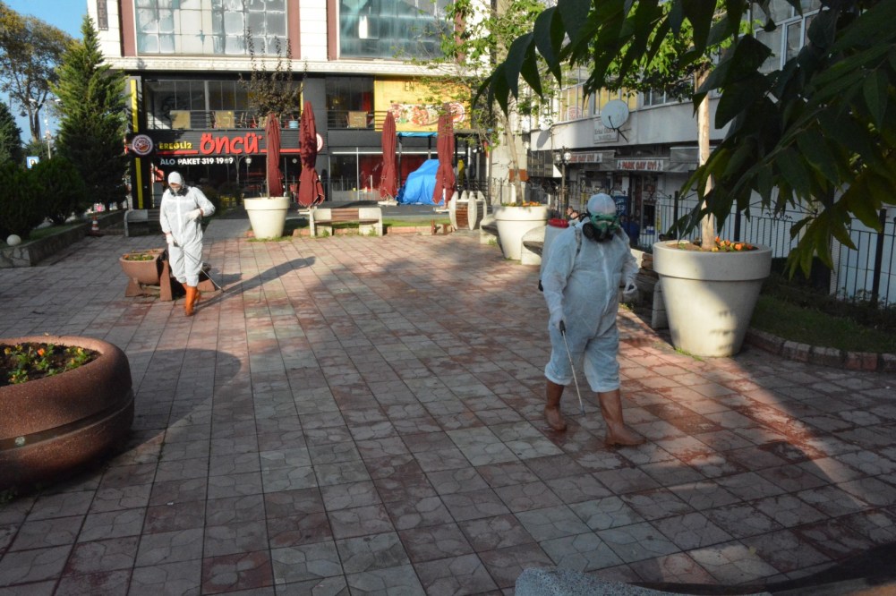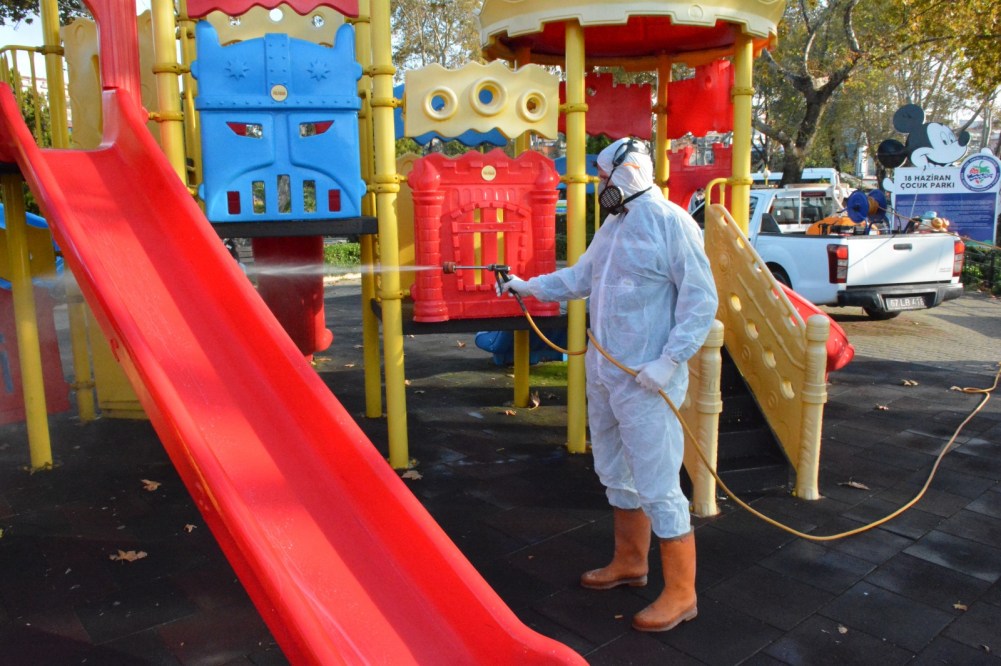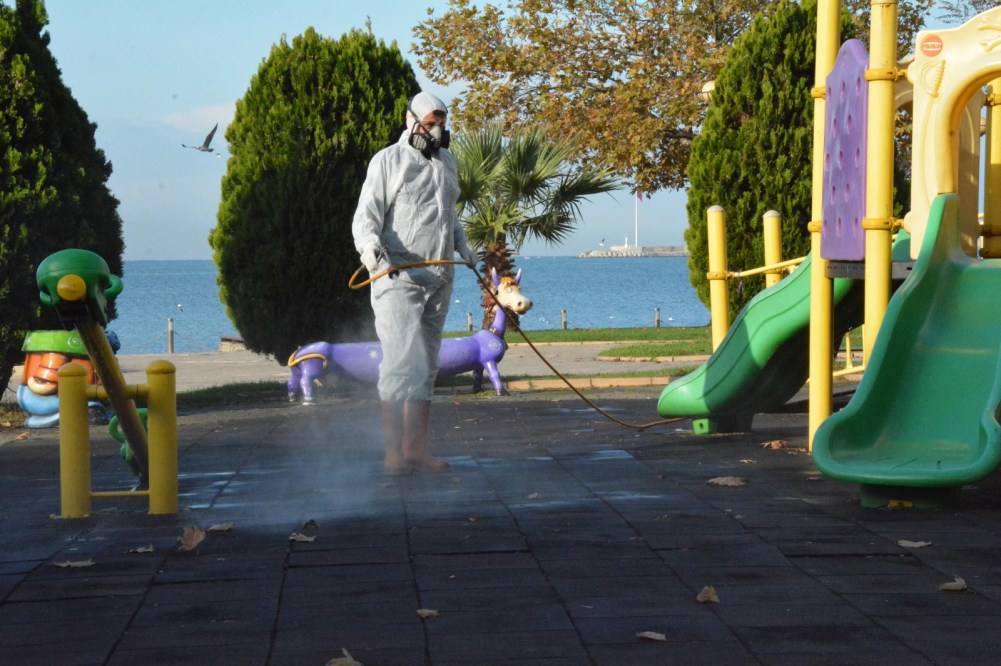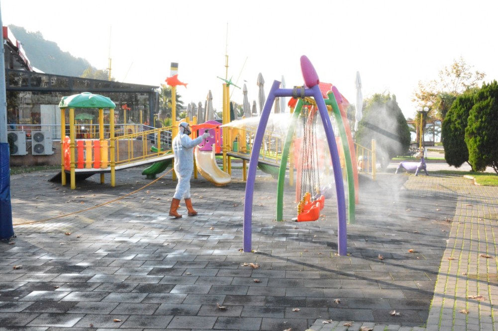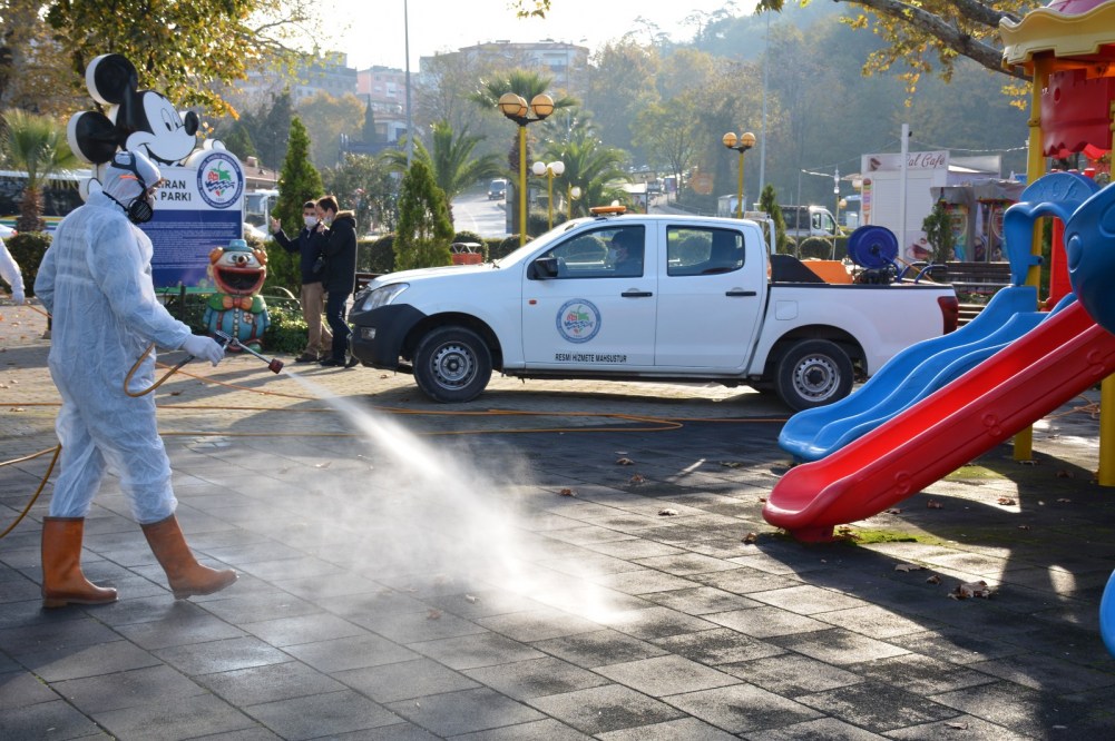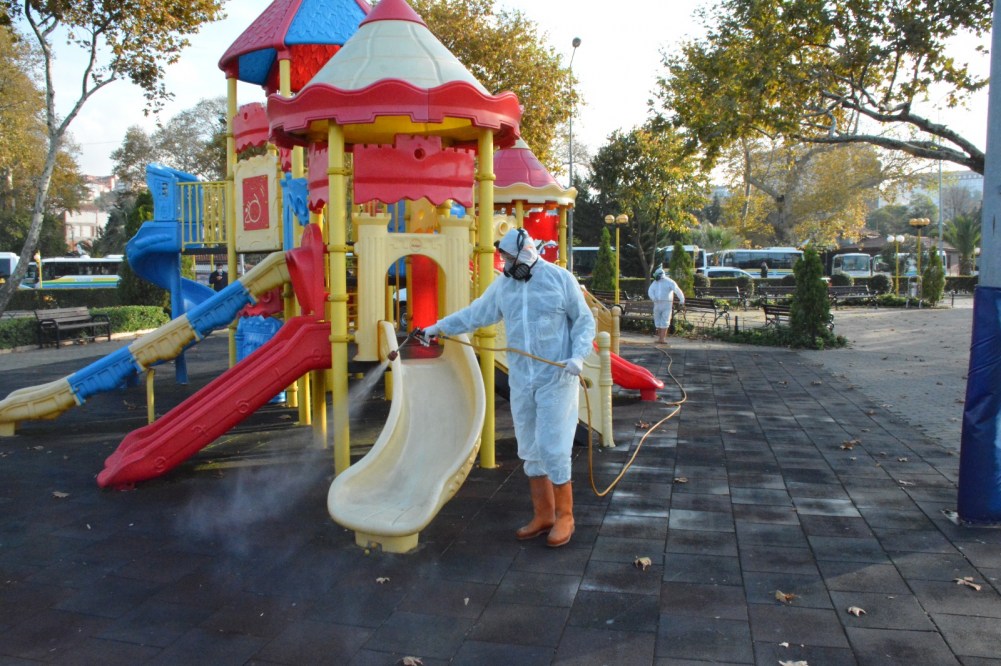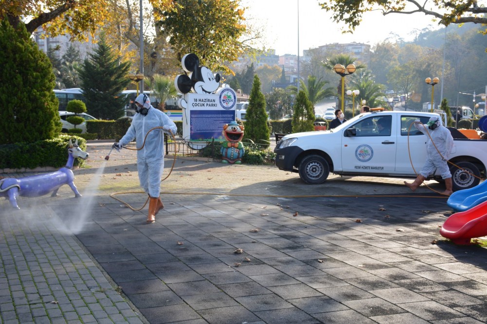 2 ayrı ilaçlama ekibi sabah saatlerinden itibaren halkın yoğun olarak kullandığı çocuk parkları ile oturma ve yürüme alanlarını dezenfekte ettiler.