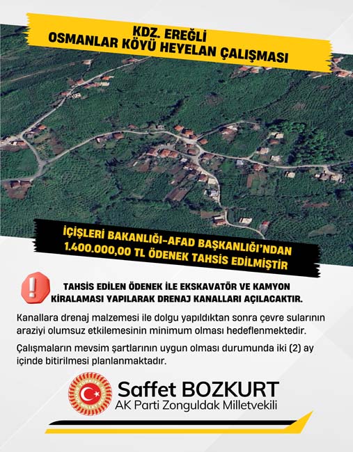 Milletvekili Bozkurt konu hakkında yaptığı açıklamada şu görüşlere yer verdi; “Karadeniz Ereğli Osmanlar Köyü heyelan çalışması için İçişleri Bakanlığı-AFAD Başkanlığı’ndan 1.400.000.00 TL ödenek tahsis edilmiştir.