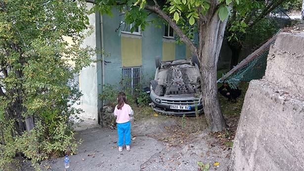 Karabük’te sürücüsünün kontrolünü kaybettiği otomobil, 3 metre yükseklikten bir evin bahçesine uçtu. Ters dönen otomobildeki yabancı uyruklu anne ve kızı yaralandı.