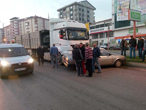 gelen trafik kazasında, TIR'ın altına giren otomobil yaklaşık 50 metre