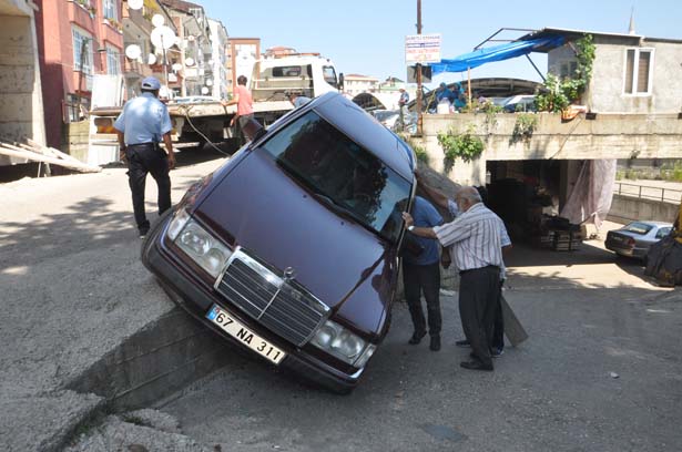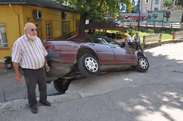 51 yıllık ehliyet sahibi olduğunu ve ilk defa böyle bir şeyin başına geldiğini söyleyen Cemal Dirimeşe, "Parktan çıkıyordum karşımdan da bir araba geliyordu. Yolu paylaşmak istedim ama tekeri yanlış yapılmış yere kaptırmışım. Arabada 3 kişi vardı. Çekici gelecek düzeltecek sonra tamirhaneye gideceğim. Aktarılmasın diye kalasla destek koyduk. 78 yaşındayım ve 51 yıllık ehliyet sahibiyim. İlk başıma böyle bir şey geliyor ama burasının yanlış yapıldığını herkes görsün. Belediye bilsin ve yapsın veya yaptırsın. İki araba yan yana geçemiyor. Birde korkuluk yapılmamış. Verebilirsem mahkemeye vereceğim" dedi.