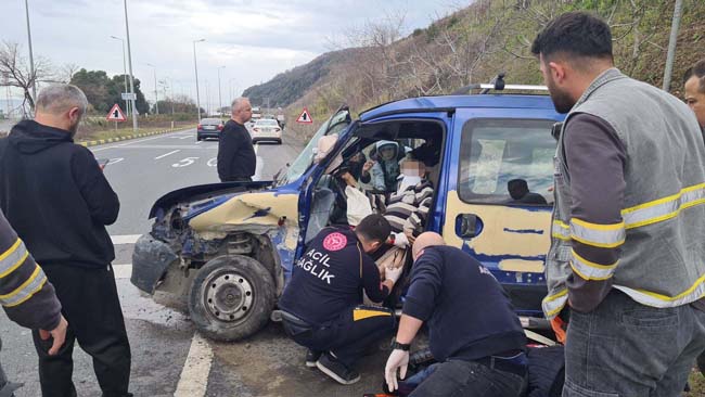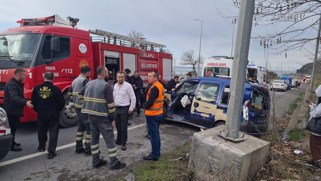 Zonguldak’ın Alaplı ilçesinde beton direğe çarpan otomobilde sıkışan 3 yaralıyı kurtarmak için ekipler zamanla yarıştı.