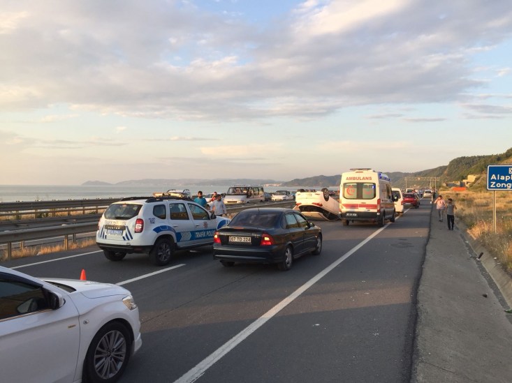 Kaza Alaplı Akçakoca karayolu Çayağzı mevkiinde, Ömer Özcan (28) idaresindeki 06 BCE 231 plakalı otomobil ile İlkay Türk (35) yönetimindeki 06 JT 061 plakalı otomobil, Zonguldak-Düzce Batı Karadeniz Bağlantı Yolunun Çayağzı mevkiinde çarpıştı. Kazada, Ömer Özcan ile devrilen otomobilde bulunan İlkay (35), Güler (30), Ecem (25) ve Mesut Eren Türk (20) yaralandı. Yaralılar çeverdeki vatandaşların haber verdiği 112 ekiplerinin olay yerinde yaptığı ilk müdahalenin ardından özel ve devlet hastanesine kaldırılarak tedavi altına alındı. Kaza nedeniyle tek şeritten verilen trafik, araçların kaldırılmasıyla normale döndü. Kaza ile ilgili savcılık soruşturma başlattı.