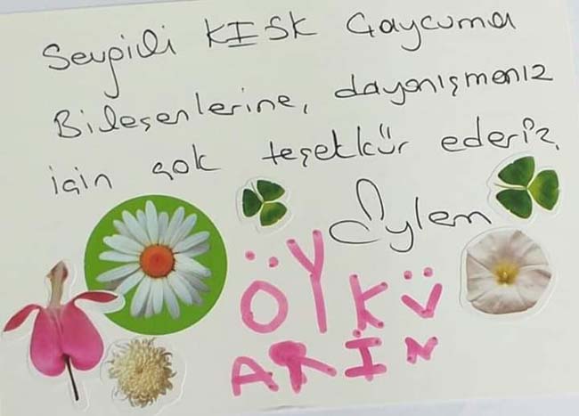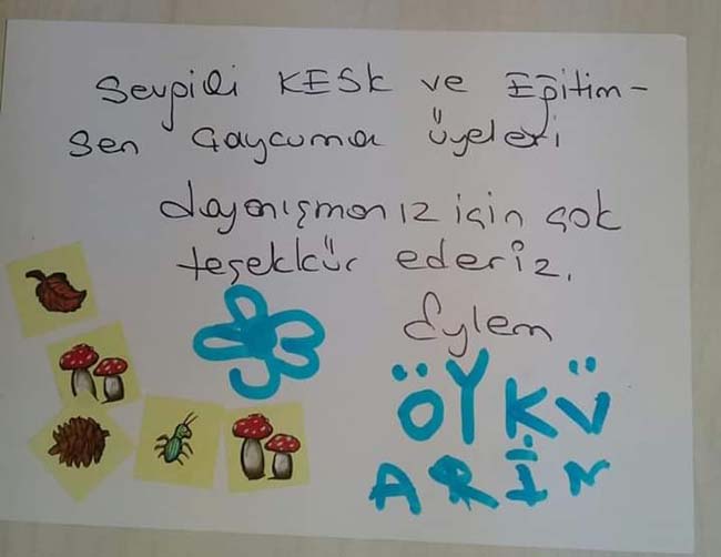 Eğitim Sen Çaycuma Temsilciliğinden yapılan açıklamada, "Bu güzel kartlar için Sevgili Öykü Arin’e ve annesi Eylem Şen Yazıcı’ya teşekkür ediyoruz. Öykü Arin’in iyileşeceğine bütün kalbimizle inanıyoruz. Öykü Arin'i çok seviyoruz ve önümüzdeki yıl Çaycuma'da 16'ncısını yapacağımız uçurtma şenliğine bekliyoruz" denildi. Eğitim Sen Çaycuma Temsilciliği ve KESK Çaycuma Bileşenlerinin çağrısıyla geçtiğimiz ocak ayında Öykü Arin ve tüm lösemi hastaları için Çaycuma'da Kızılay aracılığıyla iki kez kök hücre kampanyası yapılmış, kampanyaya çok yoğun bir katılım olmuştu.