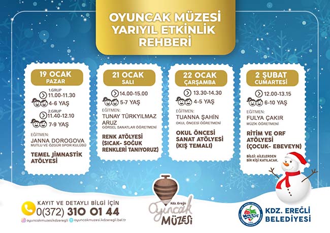 Kdz. Ereğli Belediyesi Oyuncak Müzesi Koordinatörü Melih Can Tanrıkulu, yarıyıl tatilinde gerçekleşecek atölye çalışmalarını açıkladı. Oyuncak Müzesi Atölye çalışmalarına katılmak isteyen veliler 0372 310 01 44 numaralı telefondan ön kayıt yaptırabilirler.