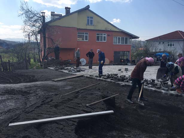 edilen parke taşları ve diğer malzemeler 'imece' usulüyle yola döşeniyor. 1500