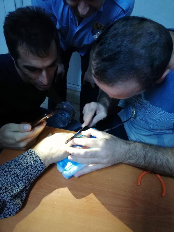 Zonguldak'ın Alaplı ilçesinde yüzüğün sıkması sonucu parmağı şişen yaşlı kadın itfaiye ekiplerinin yaklaşık 20 dakikalık çalışmasının ardından parmağında ki yüzük çıkarıldı.
