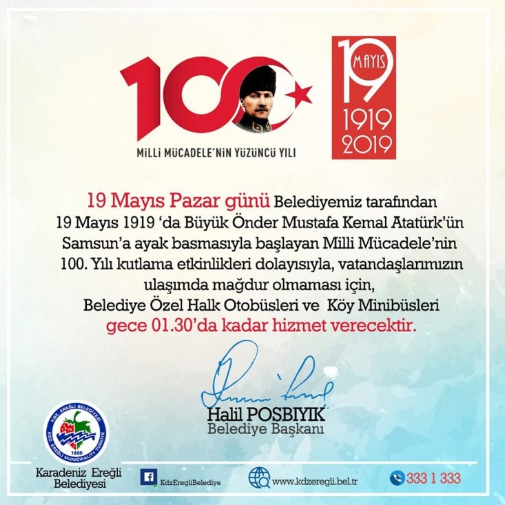 Büyük Atatürk'ün 19 Mayıs 1919'da Samsun'a çıkışının 100. yılı dolayısıyla Kdz. Ereğli Belediyesi tarafından saat 22.00'de düzenlenecek "Büyük 100.Yıl Yürüyüşü" ve ardından saat 23.00'de gerçekleşecek İrem Derici konserinden sonra halkın ulaşımda sıkıntı yaşamaması için Belediye Özel Halk Otobüsleri ve Köy Minibüsleri gece 01.30'a kadar hizmet verecek.
