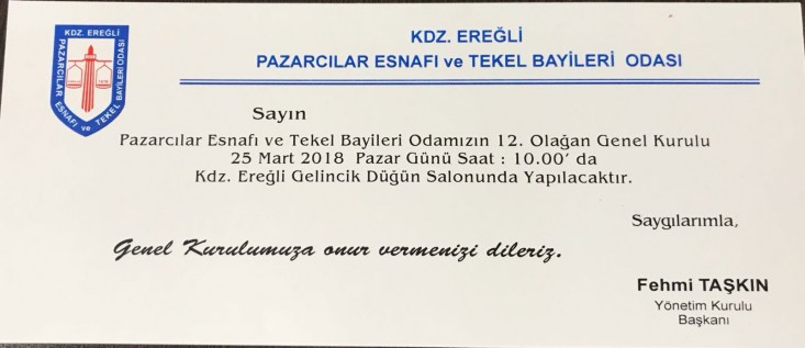 Zonguldak'ın Ereğli ilçesi Pazarcılar Esnafı ve Tekel Bayileri odasının 12. Olağan genel kurulu 25 Mart Pazar günü Gelincik düğün salonunda gerçekleştirilecek. Mevcut Başkan Fehmi Taşkın'ın genel kurula tek liste ile gireceği öğrenildi.