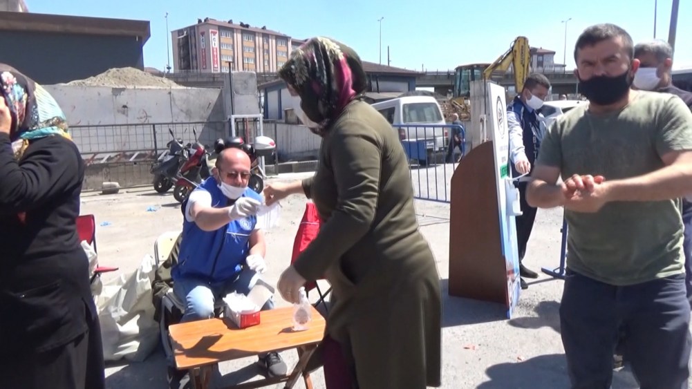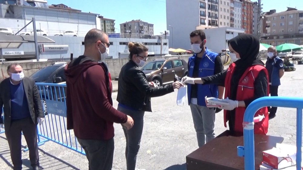 Pazaryerinin giriş ve çıkışlarında görevliler tarafından vatandaşlara dezenfektan, eldiven ve maske dağıtımı gerçekleştirildi.
