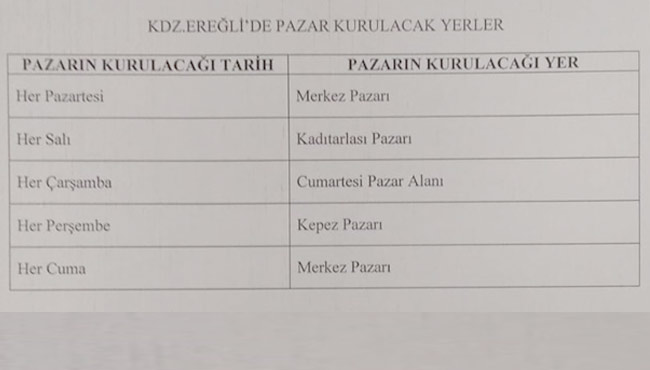 Zonguldak’ın Ereğli ilçesi Pazarcılar ve Tekel Bayileri Odası Başkanı Fehmi Taşkın, PANJDEMİ salgını kararları doğrultusunda Pazar yerlerinin açılış günleri ile ilgili yeni düzenleme yapıldığını bildirdi.