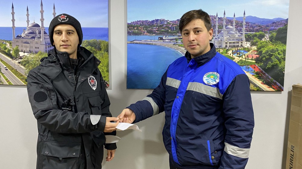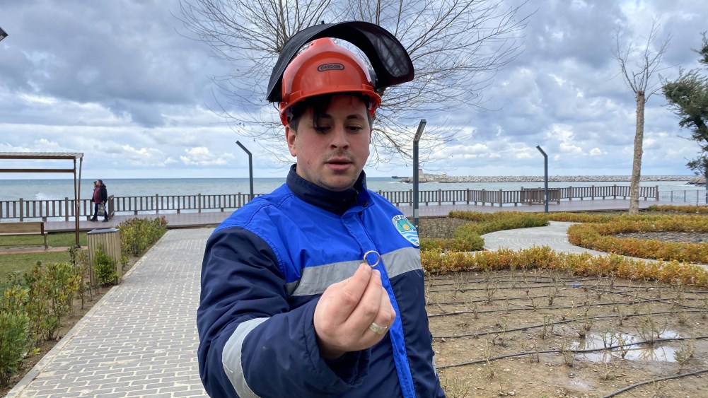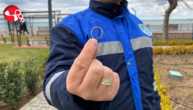 Zonguldak Belediyesinde görevli personel olarak çalışan Sercan Çakır, Uzunmehmet Camii'nde otları temizlediği sırada bulduğu altın küpeyi belediye özel güvenlik personeline teslim ederek duyarlılık örneği gösterdi.
