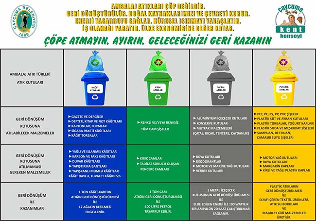Çaycuma Kent Konseyi Başkanı Tuğrul Dereli yaptığı açıklamada, “Yaşadığımız bu yüzyılda ortaya çıkan küresel ısınma, çevreyi tehdit eden sanayileşme ve çevre kirliliği birtakım önlemler almamızı gerektirmektedir. Hem kurumsal düzeyde hem de bireysel olarak alacağımız önlemlerle gelecek kuşaklara çok daha temiz bir dünya bırakmamız mümkün. Bu önlemlerden biri de sıfır atık uygulaması ile evimizden çıkardığımız çöpü büyük oranda azaltmak. Çaycuma Belediyesi, “Ambalaj atıkları çöp değildir, geri kazanılabilir ve ülke ekonomisine değer katar” bilinciyle yaklaşık 6 yıldır ambalaj atıklarını çöplerden ayrı toplayıp, kurduğu ambalaj atıklarını ayırma tesisinde ayrıştırıp ekonomiye kazandırıyor. Ören Yapı Sitesinde başlattığımız pilot uygulama ile vatandaşlarımızın ambalaj atıklarını (kağıt, atıklar-cam, atıklar-metal, atıklar-plastik, atıklar) artık kaynağında ayrıştırıp, kağıt atıklar için mavi, metal atıklar için gri, plastik atıklar için sarı ve cam atıklar için yeşil renkte ambalaj atık kutularına ayrı ayrı bırakmaları konusunda bilinç ve farkındalık oluşturmayı hedefliyoruz. Bunun için eğitim vereceğiz, düzenli takip ve kontrol yapacağız. Vatandaş olarak bu bilince ve farkındalığa sahip olduğumuzda atık oluşumunu önemli derecede azaltabiliriz. Çöp döküm alanlarında yığınları azaltmayı sağlayarak buradan oluşan ve küresel ısınmanın nedenleri arasında bulunan metan gazının atmosfere yayılımını önleyebiliriz. Ambalaj atıklarını kaynağında ayırarak ayırma tesislerinde daha az zaman ve işgücü ile ayırma işlemi yapılmasını sağlayabiliriz. Ambalaj atıklarının geri dönüşümüne destek olarak ülke ekonomisine ve geleceğimize değer katabiliriz. Doğal kaynaklarımızın olması gerekenden hızlı bir şekilde tüketilmesine ve gelecek yıllara yönelik ciddi çevre ve kaynak sorunlarının ortaya çıkmasına engel olabiliriz. Ambalaj atıklarının geri dönüşümü ile enerji tasarrufu sağlayabiliriz. Gelecek nesillere daha temiz ve kaynakların israf edilmediği bir gelecek bırakmak için ambalaj atıklarımızı evimizde, işyerimizde yani kaynağında ayıralım, bu atıklar için ayrılan kutulara bırakalım” dedi.