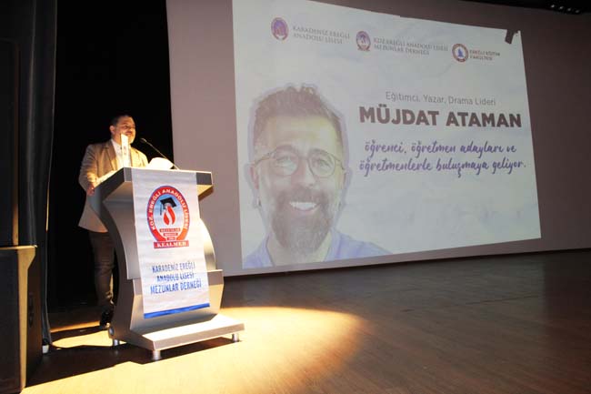 Kdz. Ereğli Mezunlar Derneği tarafından 24 Kasım Öğretmenler Gününe özel olarak BEÜ Eğitim Fakültesi ve Kdz. Ereğli Anadolu Lisesi işbirliği ile 21 Kasım 2024 Perşembe günü Erdemir Kültür Merkezi’nde gerçekleştirilen seminer programında Eğitimci Yazar Drama Lideri Müjdat Ataman, 3 ayrı seansta gerçekleştirdiği sunumlarda, 75 eğitim kurumundan 1000 katılımcı ile bir araya geldi.