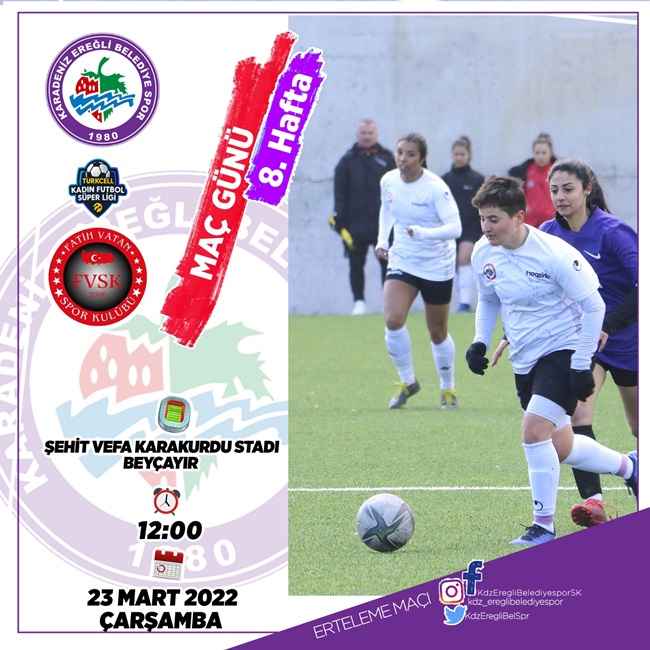 Turkcell Kadınlar Futbol Süper Lig’de mücadele eden Kdz. Ereğli Belediyespor olumsuz hava şartları dolayısıyla ligin 8. Haftasında ertelenen Fatih Vatanspor’u konuk ediyor.