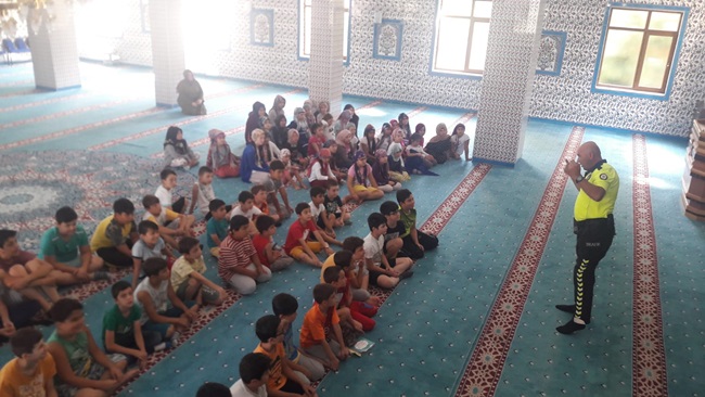 Trafik Tescil ve Denetleme Büro Amirliği ekipleri, yaz tatiliyle birlikte camilerde başlayan Kuran kurslarına giden çocukları eğitmek için çalışma başlattı. İlk olarak Kepez Nur Camii’ndeki kurslara katılan trafik polisleri, Kuran eğitimi alan çocuklara trafik kurallarını anlattı. Kuran kurslarındaki trafik dersini planlı olarak ilçe genelinde devam ettiren polisler, toplam 250 çocuğu trafik konusunda bilgilendirdi.