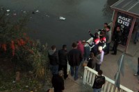 Çevrede toplanan kalabalık, deredeki arama çalışmalarını meraklı gözlerle