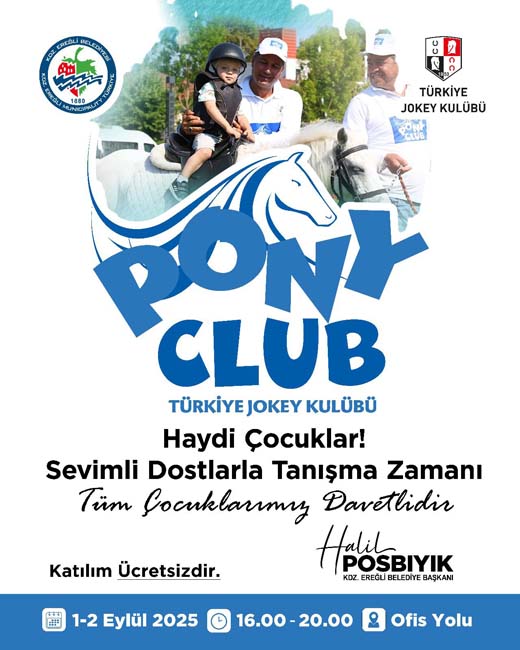 Kdz.Ereğli Belediyesi ve Türkiye Jokey Kulübü (TJK) işbirliği ile çocuklara at sevgisini aşılamak amacıyla düzenlenen “Pony Club Şehrinize Geliyor Etkinliği” 1-2 Eylül 2025 tarihlerinde ilçemizde gerçekleşecek.