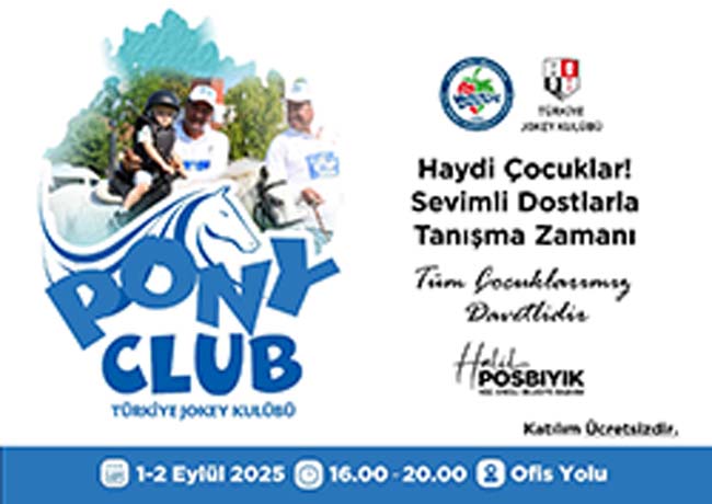 2014 yılından bu yana Türkiye’nin her köşesinde çocukları pony atlarla buluşturan Türkiye Jokey Kulübü (TJK), 1-2 Eylül 2025 tarihlerinde ilçemizde düzenleyeceği “Pony Club Şehrinize Geliyor" etkinliği ile çocuklara iki gün boyunca atları yakından görme ve atlı gezinti fırsatı sunacak.
