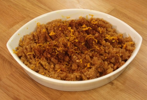 Başka bir kuru tencereye irmiği koyun ve yağsız, sürekli karıştırarak iyice esmerleşene kadar kavurun. Bu işlemin yarısında çam fıstıklarını da irmiğe ilave edin.