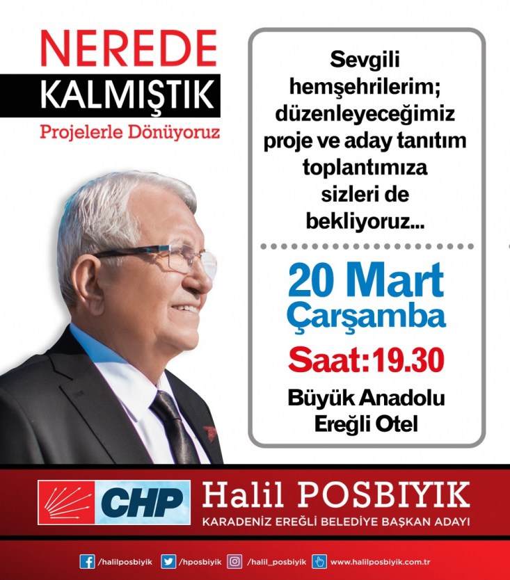 CHP Kdz.Ereğli Belediye Başkan Adayı Halil Posbıyık, 'Nerede Kalmıştık! Projelerle geri dönüyoruz' adlı proje ve aday tanıtım toplantısını 20 Mart Çarşamba günü gerçekleştirecek.
