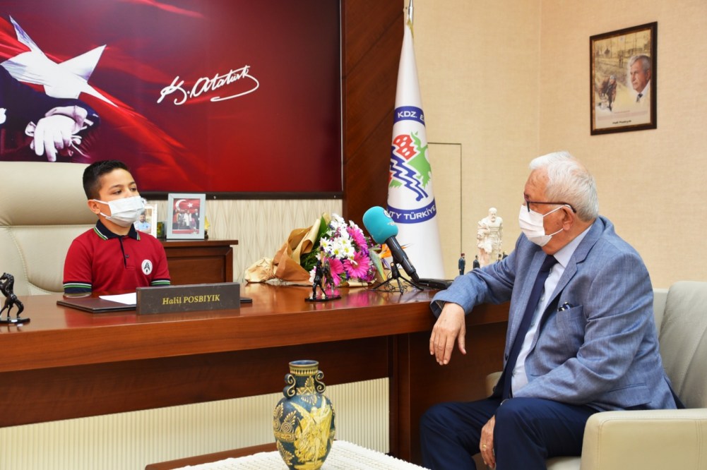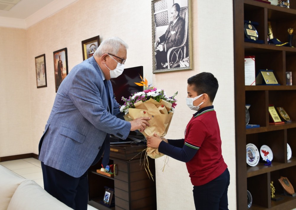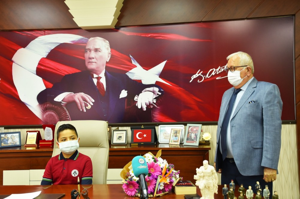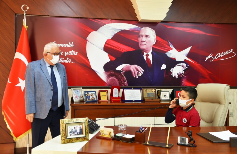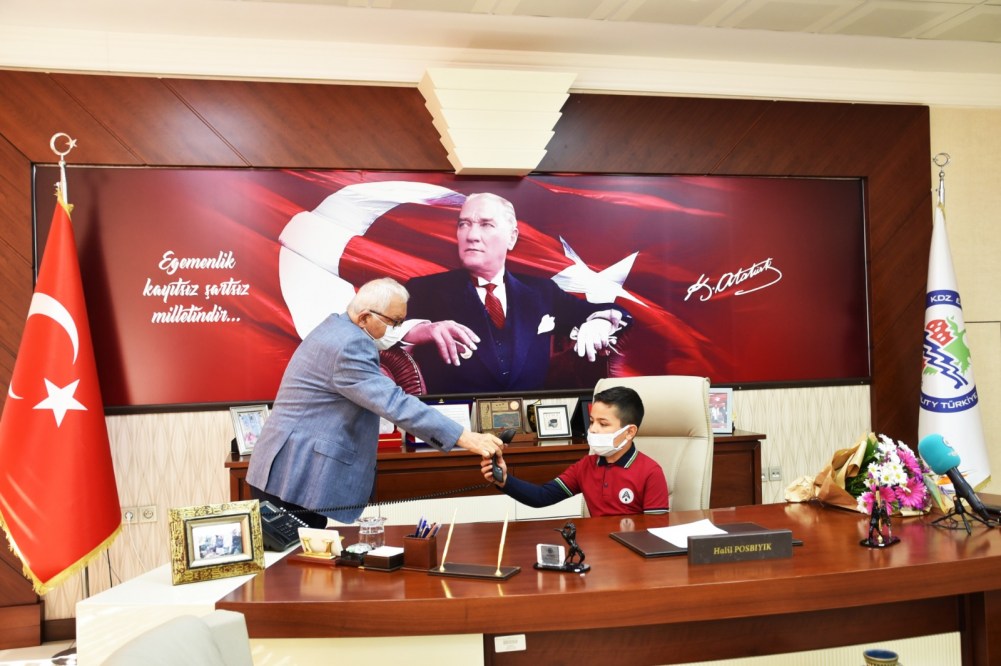Okul Müdürü Osman Özatan ve öğretmeni Sultan Çivici ile birlikte makama gelen İsmail Eymen Göksel, Başkan Posbıyık’a çiçek takdiminin ardından koltuğa oturdu. Göksel, ilk demecinde “Ulusal Egemenlik ve Çocuk Bayramı’nı bizlere armağan ettiği için Atatürk’e çok teşekkür ediyorum. Hepinizin bayramını kutluyorum” dedi.