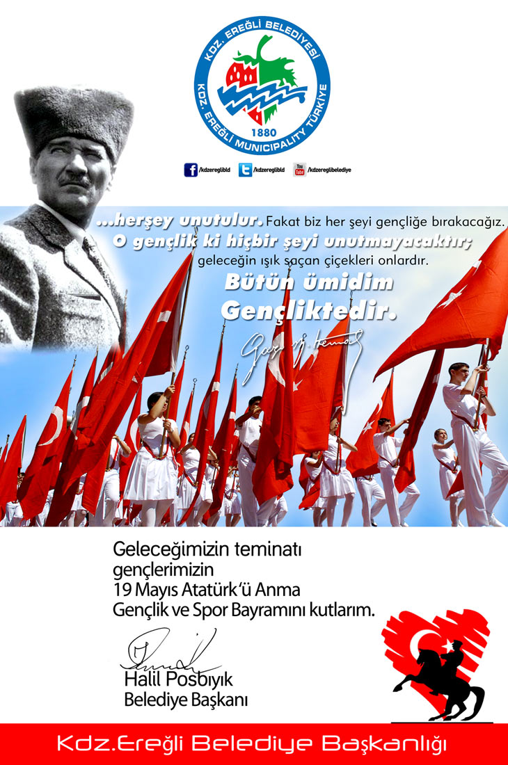 Karadeniz Ereğli Belediye Başkanı Halil Posbıyık, 19 Mayıs Atatürk'ü Anma Gençlik ve Spor Bayramı ile Büyük Ata'nın Ulusal Kurtuluş Mücadelesi için Samsun'a ayak basışının 94.yıldönümü dolayısıyla bir mesaj yayımladı.