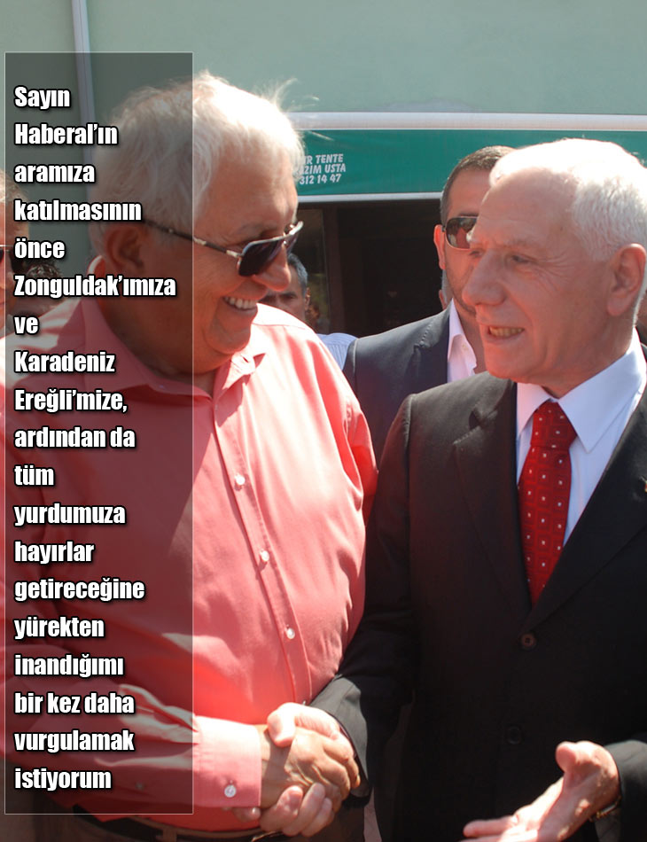 Sayın Haberal'ın kentimizde yaptığı konuşmada, henüz her şeyin yeni başladığını ve yolumuzun uzun olduğunu, şimdi mücadele zamanın geldiğini ifade eden sözleri bizlere de ayrı bir şevk vermiştir. Şundan eminiz ki, gerek Zonguldak'ın gerekse de Karadeniz Ereğli'nin sesi bundan böyle çok daha gür çıkacaktır. Mehmet Haberal'ın önderliğinde bir araya gelerek oluşturacağımız güçle, sorunlarımızın çözümü ve beklentilerimizin karşılanması noktasında yapacağımız hiçbir girişim boşa çıkmayacaktır.