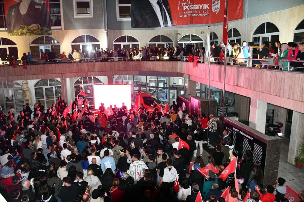 Posbıyık, bugün gerçekleştirilen Mahalli İdareler Genel Seçimlerinde bir kez daha Ereğli Belediye Başkanlığına seçilmesinin kesinleşmesi ardından, Belediye Binasından halka hitaben ‘Balkon Konuşması’ gerçekleştirdi.