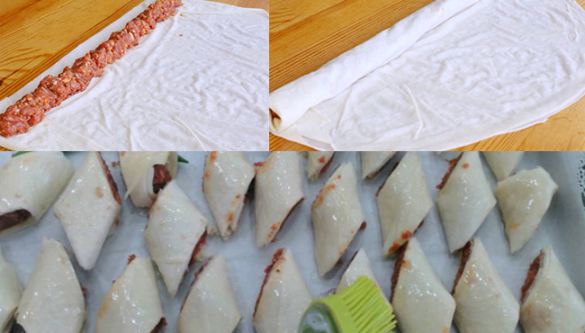 - Bir tane yufkayı tezgaha açıp ikiye katlayın, kenar kısımlarını hafif katlayın. Geniş kenarına hazırladığınız köftenin yarısını yerleştirin rulo şeklinde sarın. Diğer yufkaya da aynı işlemi uygulayın.