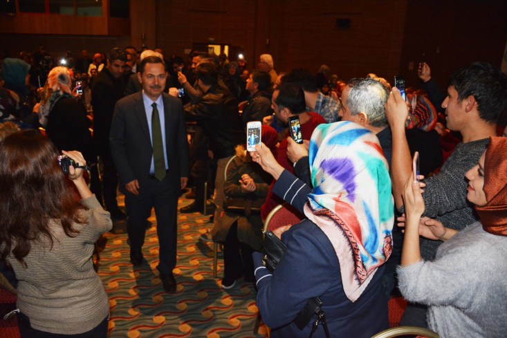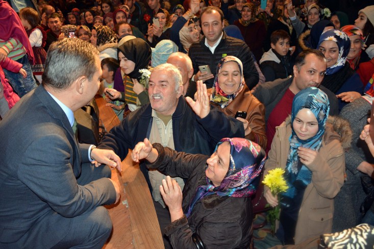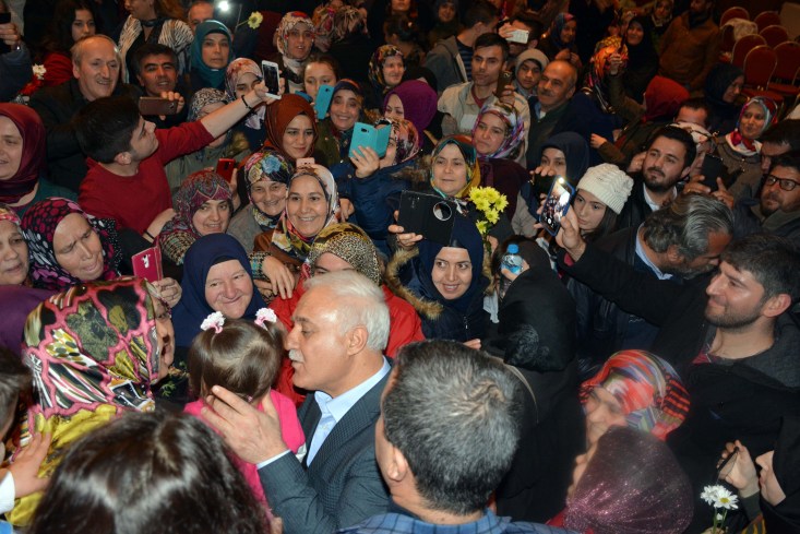 Konferans sonrası Başkan Uysal, Nihat Hatipoğlu ile birlikte vatandaşlara çiçek dağıtırken, hatıra fotoğrafı çekmek isteyenler de izdihama neden oldu.