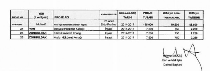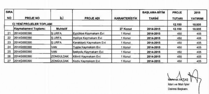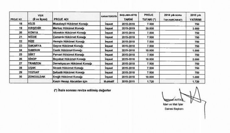 Not: Bakanlık onayı ve yatırım programı tabloları ekteki dosyada belirtiliyor.