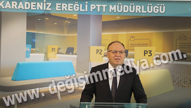 “PTT Genel Müdürlüğümüz, bugün değil, yıllara, asırlara sari hizmetler vermektedir. Bu hizmetleri verirken, destanlara, şarkılara, ağıtlara, türkülere vesile olmuş. Hep onun şarkısıyla türküsüyle, ‘Postacı geliyor, selam veriyor’ diye başlayan türküsüyle, ağıtıyla beraber olmuş. Acıları dindirmiş, ayrılıkları birleştirmiş; geçmişiyle, geleceğiyle, bugünü yakalamış, teknolojiyi en üst noktada kullanan güzel ortamlarda hizmet veren bir kurum haline gelmiş. Sadece mektup değil eskiden anladığımız gibi. Bugün baktığımız zaman, fatura ödemesi, bankacılık hizmetlerinden, aklınıza gelebilecek, vatandaşın huzurunu refahını,işini gücünü kolaylaştıracak bütün hizmeti verir hale gelmiş. Ben bugüne kadar Rahmet-i Rahman’a kavuşan bütün çalışanlarımızın hepsine Allah’tan rahmet diliyorum. Bundan sonra hizmet verecek arkadaşlarımıza hayırlı çalışmalar diliyorum. Bu kurumumuzun, bu binamızın Ereğli’mize, Zonguldak’ımıza hayırlı hizmetler vermesini diliyorum.”
